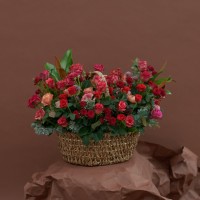 Корзина с ручкой размер XL, розы одноголовые и кустовые и сезонная зелень.
