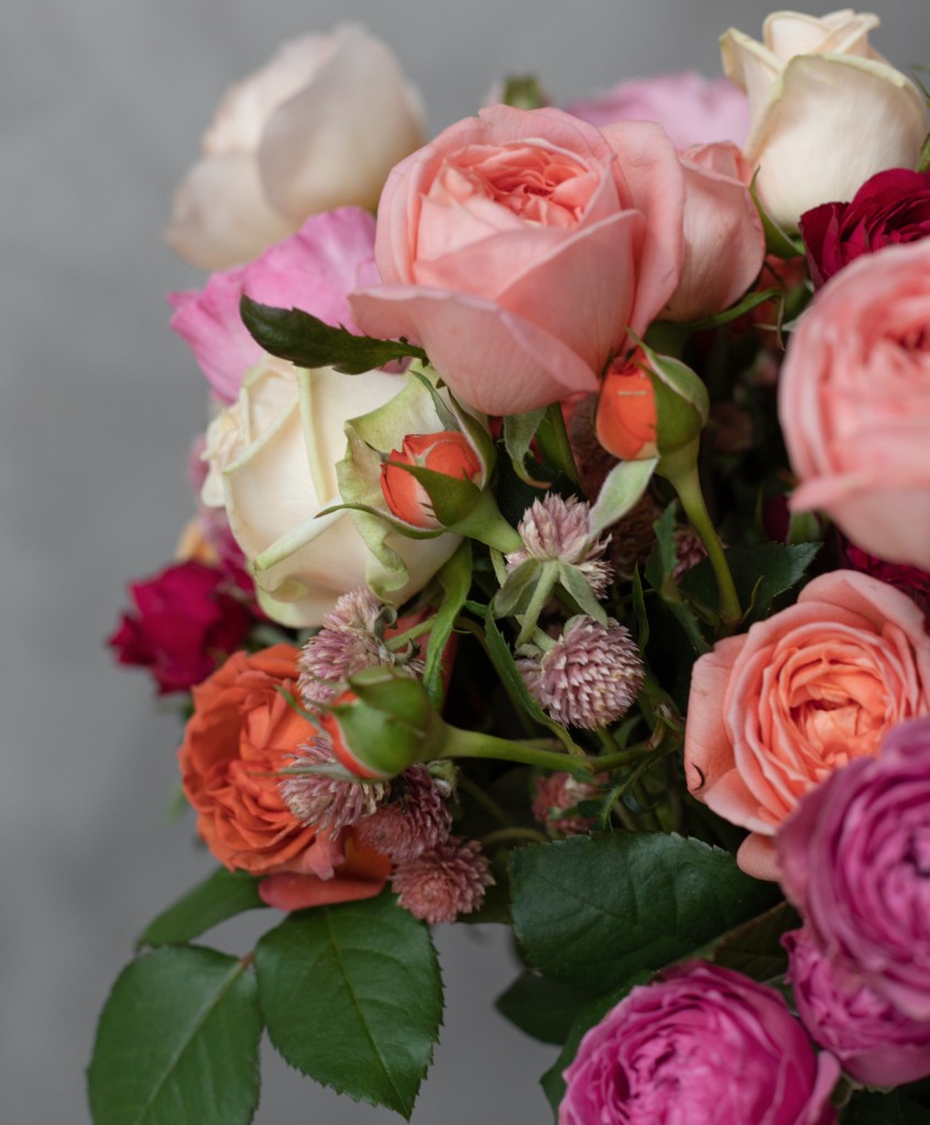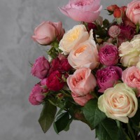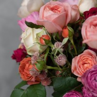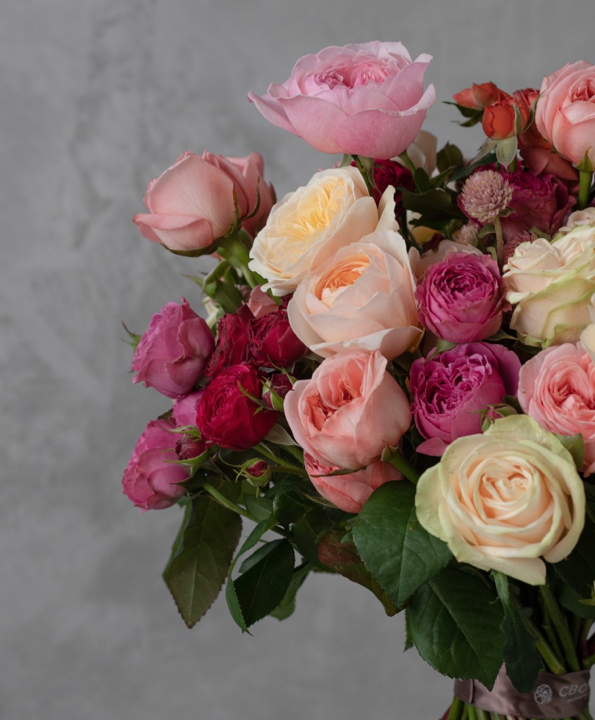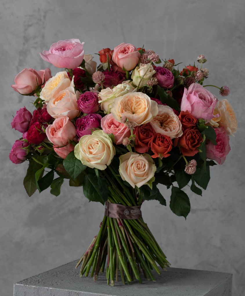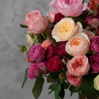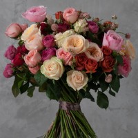 Сборный букет в розовой, ярко-розовой , персиковой гамме из 4х форм роз : кустовых, пионовидных, кустовых пионовидных и одноголовых.