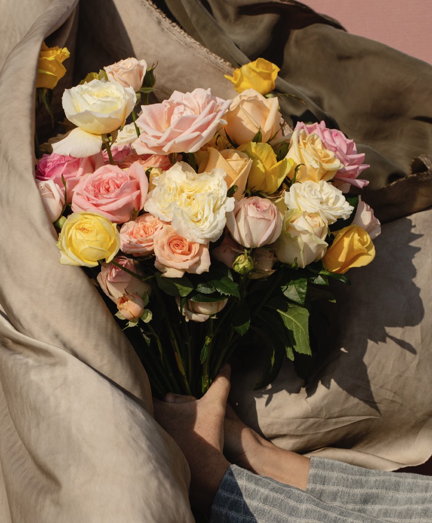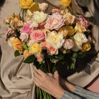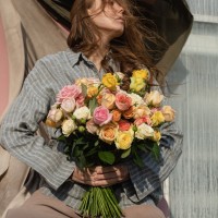 Сборный букет в розовой , желтой,, белой, кремовой гамме из 4х форм роз : кустовых, пионовидных, кустовых пионовидных и одноголовых.
